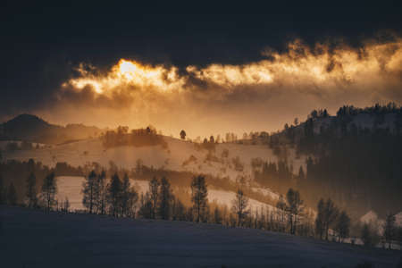 Beautiful mountain landscape with trees and a cloudy morning sky, Dumesti, Salciua, Apuseni, Romania