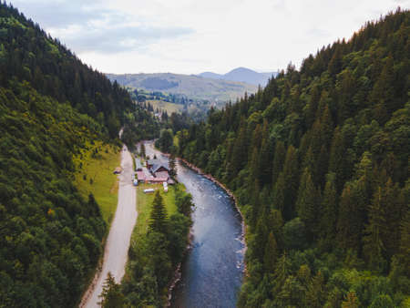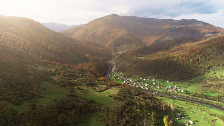 wonderful mountain village buildings at blue river against brown forestry hill peaks with clouds shadows upper view. Carpathian mountains, Ukraine beauty nature. Travel, summer holidays.
