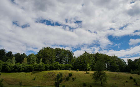 Carpathian mountains summer landscape with blue sky and clouds, natural background. Panoramic view