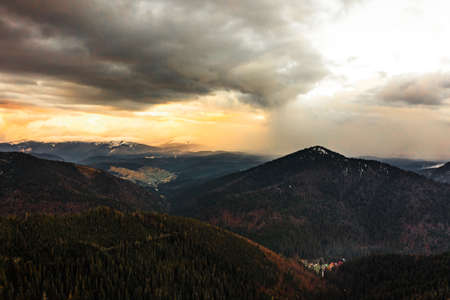 Picturesque view of mountain landscape with forest in morning. Drone photography