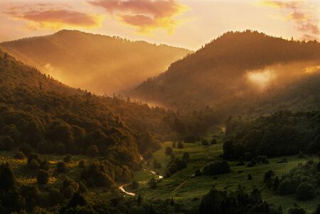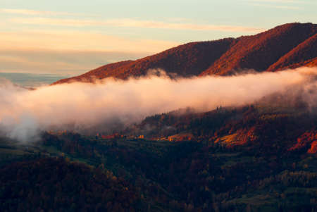 Carpathian mountains near Krivorivnya village Morning rays warm cold valley