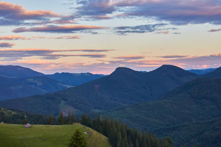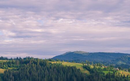 Beautiful mountain landscape at sunrise. View of hills covered forest in sunlight. Filtered image: Soft and vintage effect.