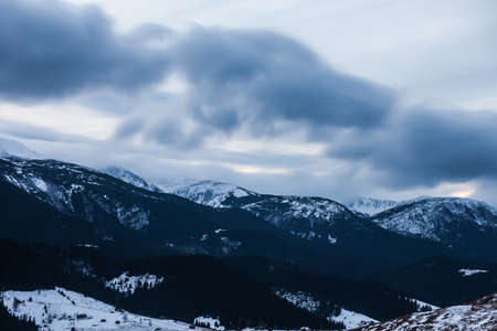 Beautiful landscape with mountain peaks covered with snow and clouds