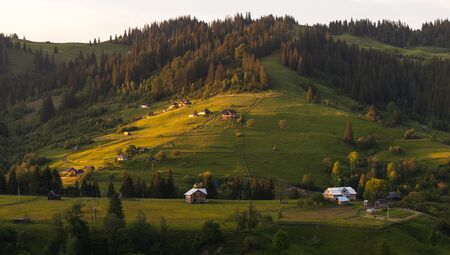 Rural mountain landscape with remote Romanian village uphill in the valleys of Carpathian mountains, in springtime