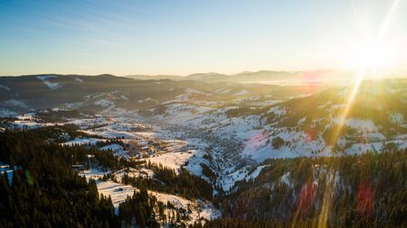 Aerial view sunny beautiful landscape of winter hills and mountains with forest thickets on a frosty winter evening against a blue sky and the setting sun. Place for advertising