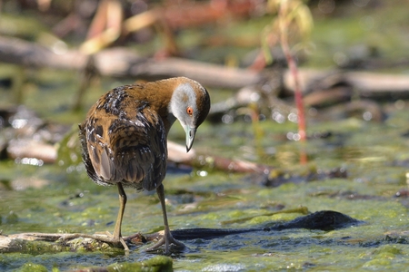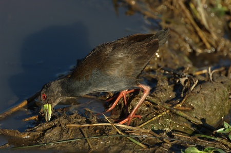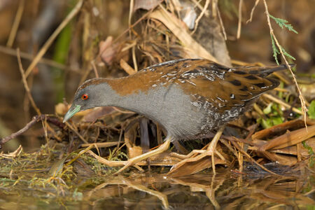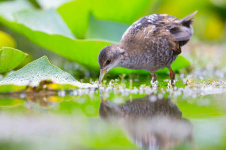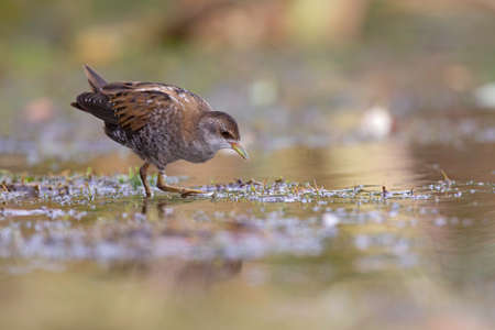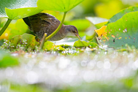 Rare and elusive Little Crake (Porzana parva) foraging in a pond