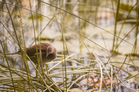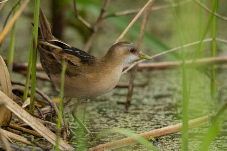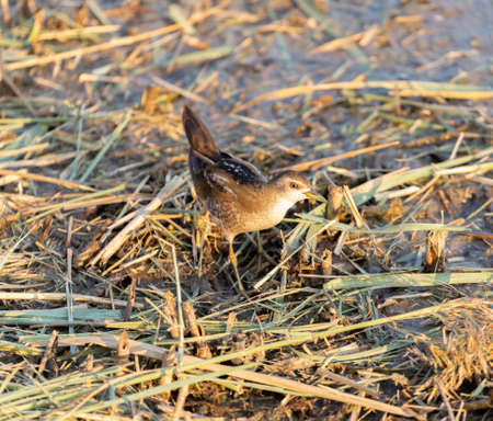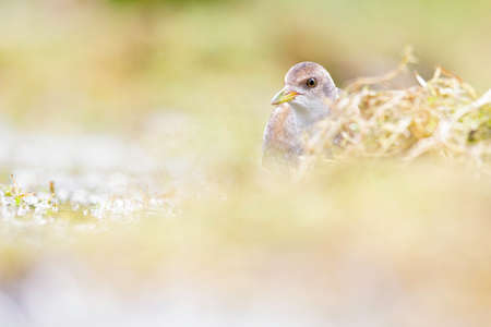Close up of a juvenile little crake (Zapornia parva) foraging at a swamp in the Netherlands.