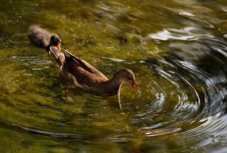 Water feathers. Mother water hen and her cub in the early evening sun. The hens swim downstream on the evening sunlit surface of a mountain river.