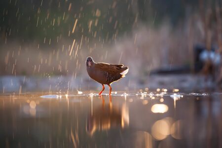 Water Rail (Rallus aquaticus) in sunset in rain