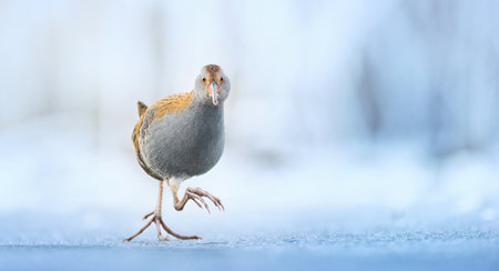 Water Rail Rallus aquaticus funny running on the ice and on the frozen surface of the lake, amazing rare photo, the best photo.