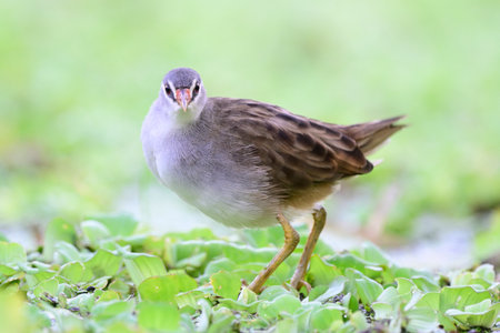 White-browed Crake (Porzana cinerea) lovely grey bird with light weight while stepping on duckweed while searching for meal in swamping pond