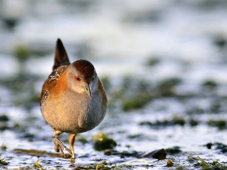 Rare and elusive Little Crake (Porzana parva) foraging on the shore of lake Metochi on Lesbos island, Greece
