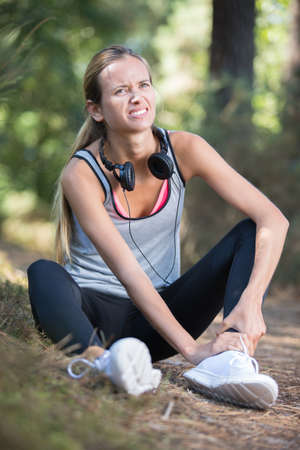Ankle sprain, woman grabbed her leg while walking on a nature. Concept of tired legs, injury on running