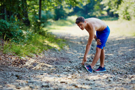 young man stretching in the park before running. Young man workout before fitness training at the park. Healthy and exercise young man warming up on the road in the forest.