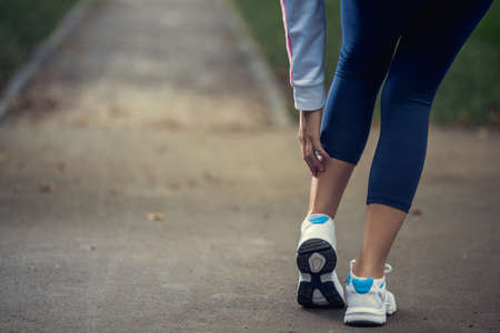 Cropped shot of woman runner suffering from ankle pain. Ankle pain may be caused by an injury, like a sprain, or by a medical condition, such as arthritis.