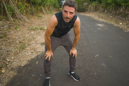 sport and fitness lifestyle portrait of young attractive sweaty and tired man exhausted after outdoors running workout on beautiful country road breathing cooling off after training hard