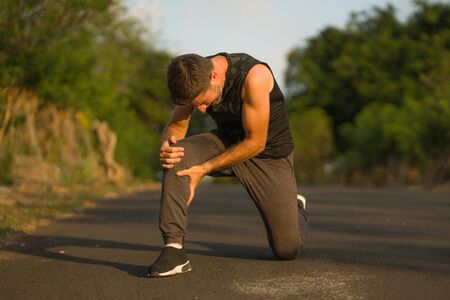 outdoors portrait of young attractive sport man in pain touching his knee suffering ligaments accident or some injury during running workout at beautiful country road in health care concept