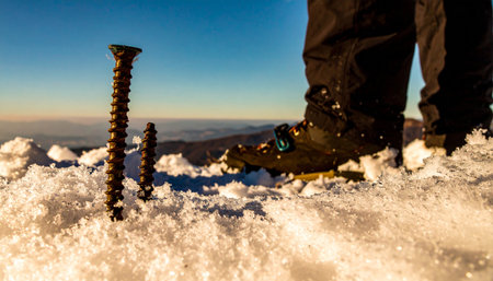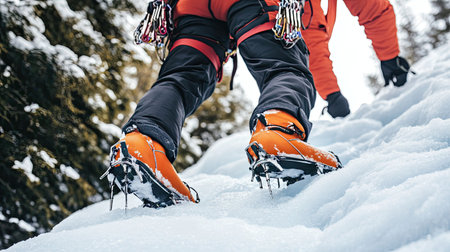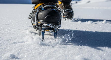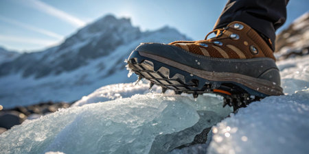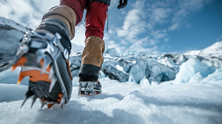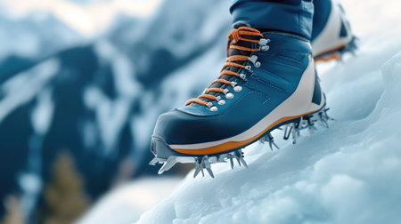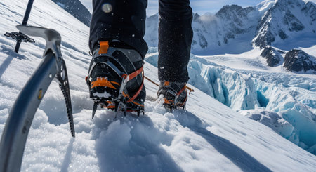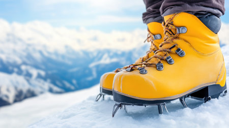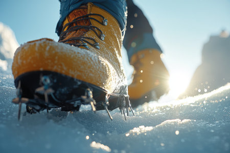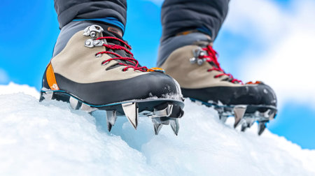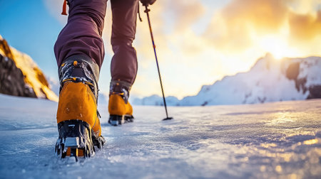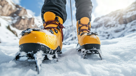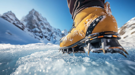 Close-up of a hiker's boots with crampons, traversing a snowy terrain The sun is shining and the mountainside is visible in the background AI Generative