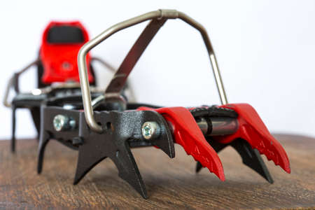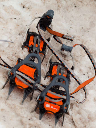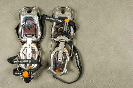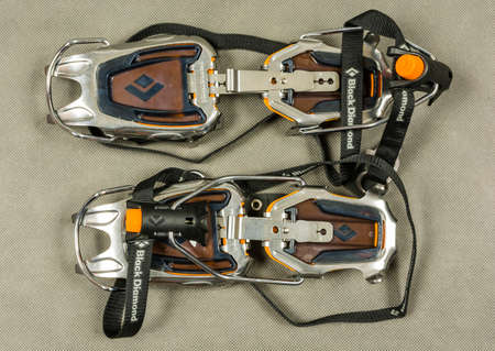 Niedomice, Poland - February 14, 2018: Technical (Automatic) mountaineering crampon - Black Diamond Sabretooth Pro.