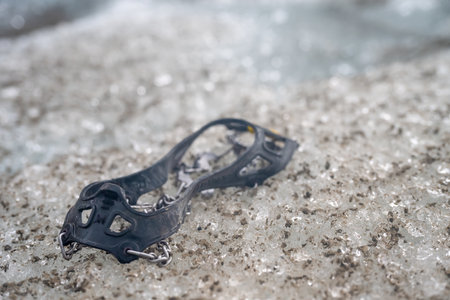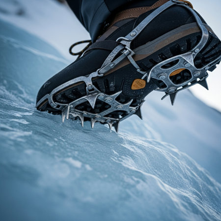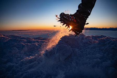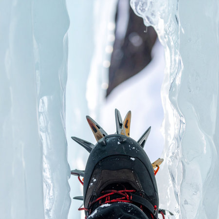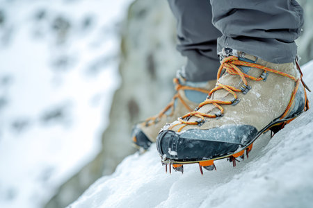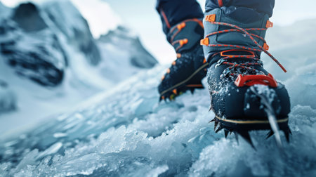 A close up of hiker boots with crampons on icy terrain, showcasing adventure