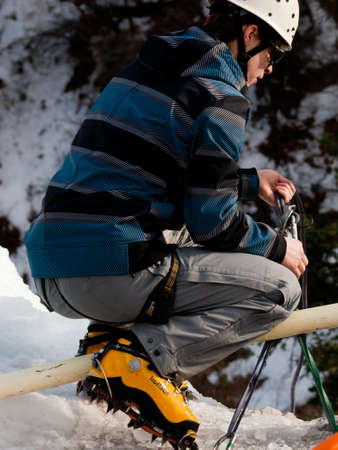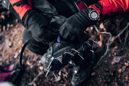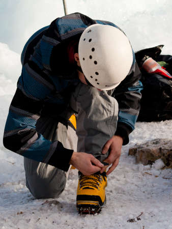 Climber fastening crampons on boots for ice climbing