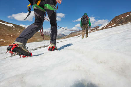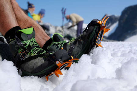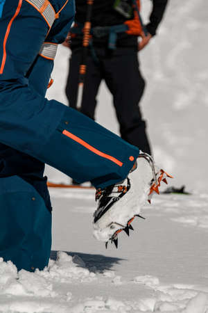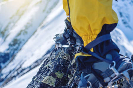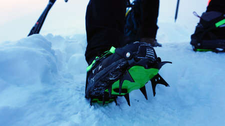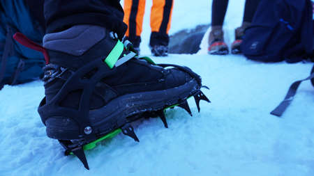 Close up of hiking shoes with crampons. Alpinist ascending a snowy mountain.