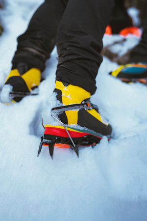 Boots with yellow crampons, winter trekking in the mountains.