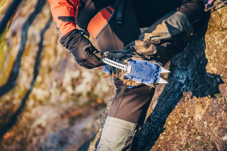 Climber fastens crampons on climbing shoes
