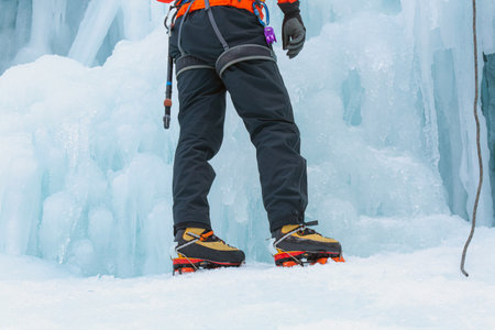 Crampons close-up on his feet ice climber, climber on a frozen waterfall
