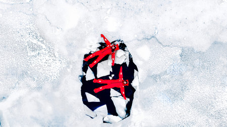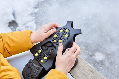 Close up of snow shoes and shoe spikes in winter.
