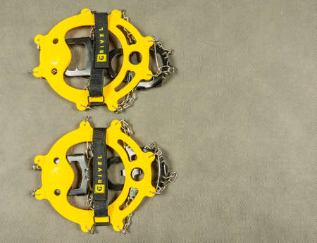 Niedomice, Poland - February 14, 2018: Mountain walking boots with semiautomatic crampons.