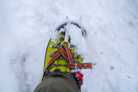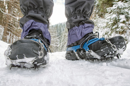 Detail of shoes in the snow with crampons during mountain walk in winter
