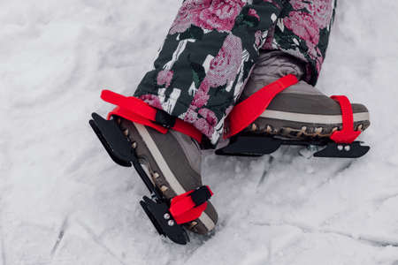 Figure skating skates. Close-up of child legs and children ice skates worn on them, snow background