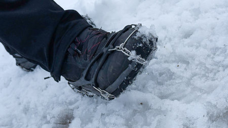 Close up shot of an ice climbers boot with crampons, sharp metal spikes that protrude from the bottom of boots and dug into the ice