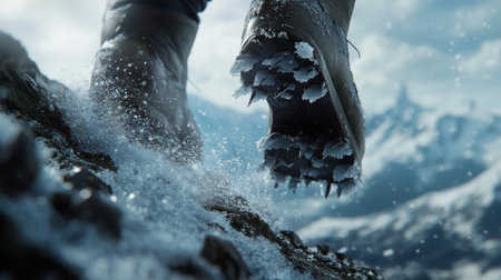 Hiker ascending a snowy mountain trail in winter with rugged boots and icy environment