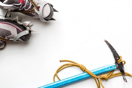 Hiking boots with equipment for ice. Snow like a background and sun. Sun is shining. Moutains and travel.