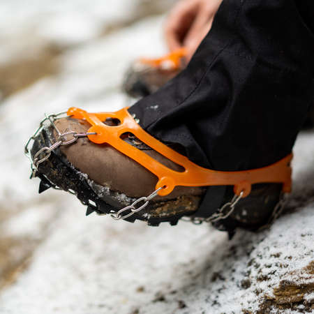 Close up of shoes with crampons. Winter trip to the mountains.
