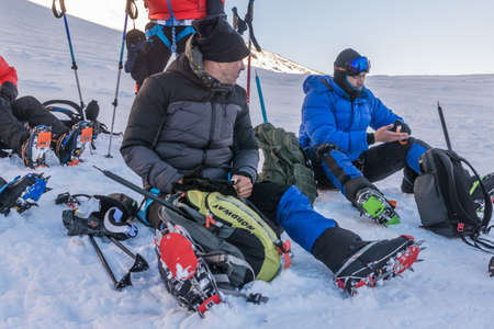 Group of tourists heading to the guided tour on the glacier, Iceland. Focus on special boots with crampons.