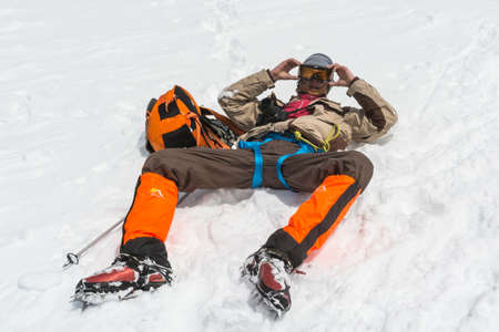 Tired exhausted climber lying under Mont Blanc du Tacul mountain. Wide opened legs in boots with crampons and mountaineering clothes with blue sky with bright sun background. Active people concept.