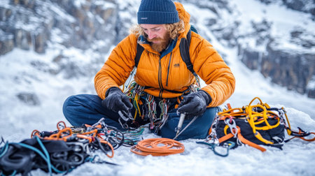 An experienced mountain climber preparing gear before an expedition, demonstrating years of expertise