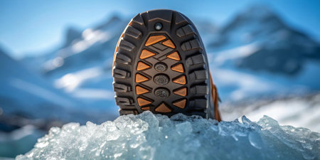 A sturdy hiking boot stands on ice, surrounded by snow and towering peaks.