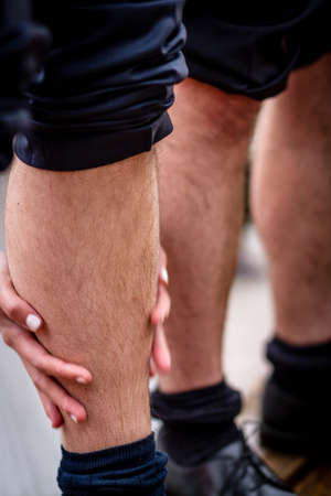 Hairy bare legs of several man lined up, touched by female hands