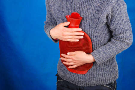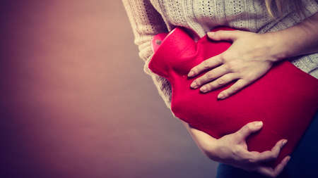Unrecognizable woman having strong stomach ache. Female suffer on belly pain, holding hot red water bottle on abdomen. Health care, remedy for pains concept