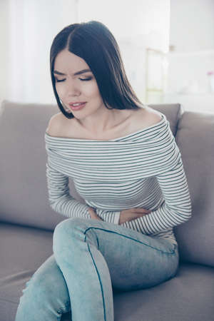 Close up side profile photo beautiful she her lady hands arms hold tummy overeating infection gastritis convulsion wear blue casual pullover jeans denim sit comfy divan house living room indoors