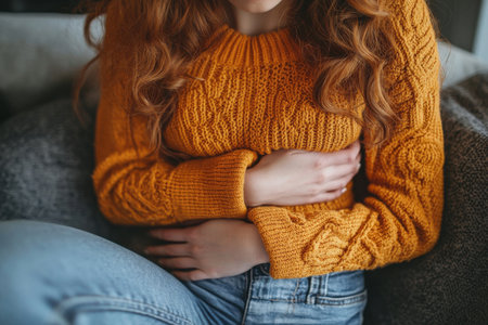 Person experiencing discomfort holds their stomach, wearing cozy sweater. soft lighting creates calm atmosphere, highlighting emotional expression of unease