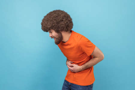 Stomach pain. Side view of sick sad unhealthy man with Afro hairstyle wearing orange T-shirt standing and holding his painful belly. Indoor studio shot isolated on blue background.