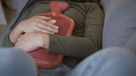 Sick woman with heavy menstrual cramps is applying a hot water bag on her stomach to relieve the pain and feel better on the living room sofa