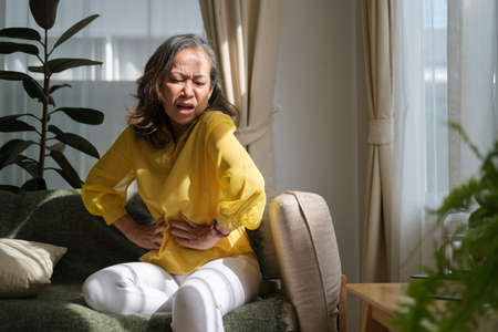 Unhappy Asian woman sitting on the sofa and holding on stomach suffering. Abdominal pain that comes from menstruation, diarrhea, or indigestion. Sickness and healthcare concept
