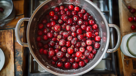 Freshly picked lingonberries in a pot. Vibrant red berries, jam, food photography. Generated by artificial intelligence.
