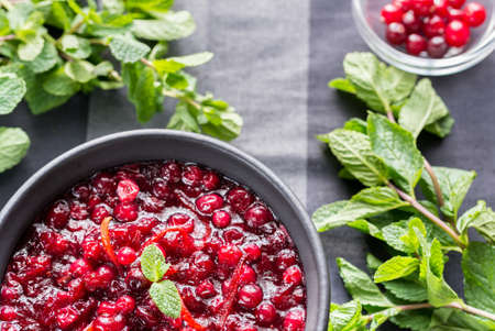 Cranberry sauce with fresh cranberries and mint in a bowl
